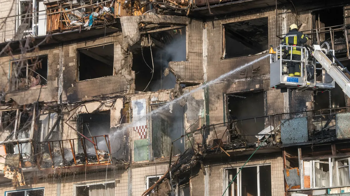 Emergency services work the site of a Russian strike on a nine-storey residential building in Kyiv, Ukraine, 14 November 2025, amid the Russian invasion. At least four people were killed and dozens others injured, including two children, as a result of the overnight combined Russian attacks on Kyiv using more than 400 shock drones and about 20 missiles of different types, according to the Kyiv City Military Administration. EPA/MAXYM MARUSENKO