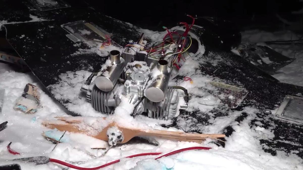 A screenshot from a video released by the Russian Defence Ministry, allegedly showing the debris of an intercepted Ukrainian drone in Russia’s northwestern Novgorod region.